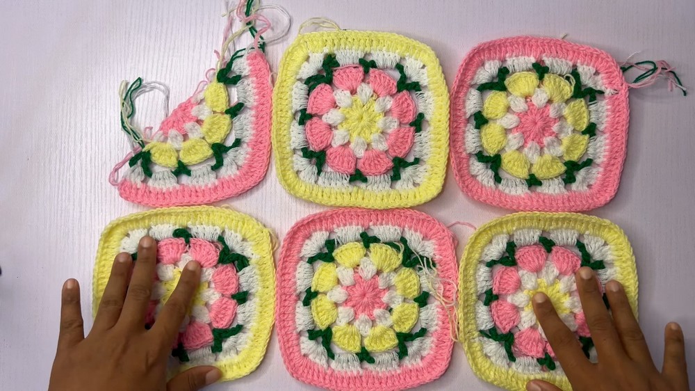 - Each square features a combination of clusters, double crochets, and chain-structured corners.