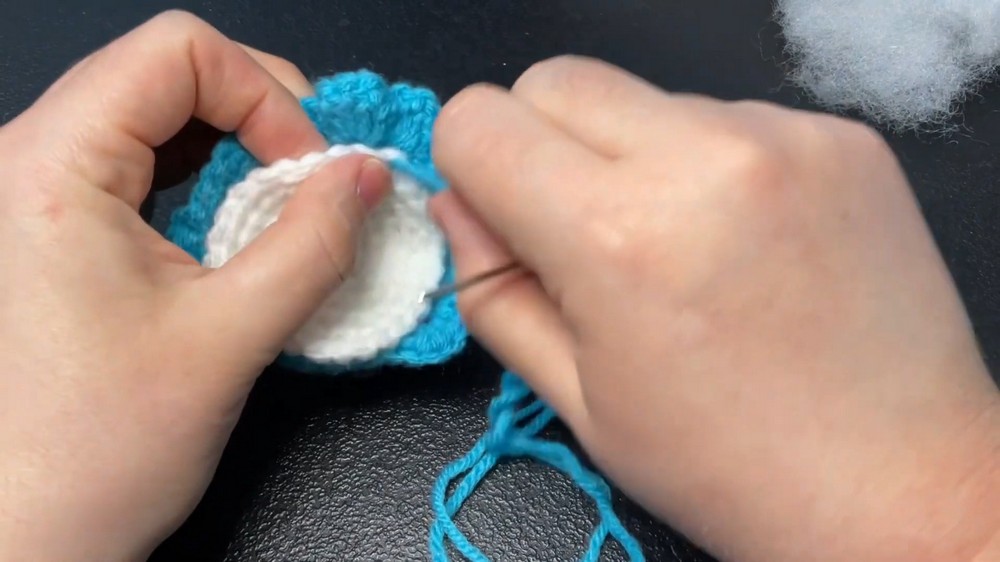 Sewing the Belly: The belly is sewn to the main body of the whale using yarn that matches the body color (blue in this case) to ensure a clean finish. The stitches are taken from underneath the fins to avoid damaging them.