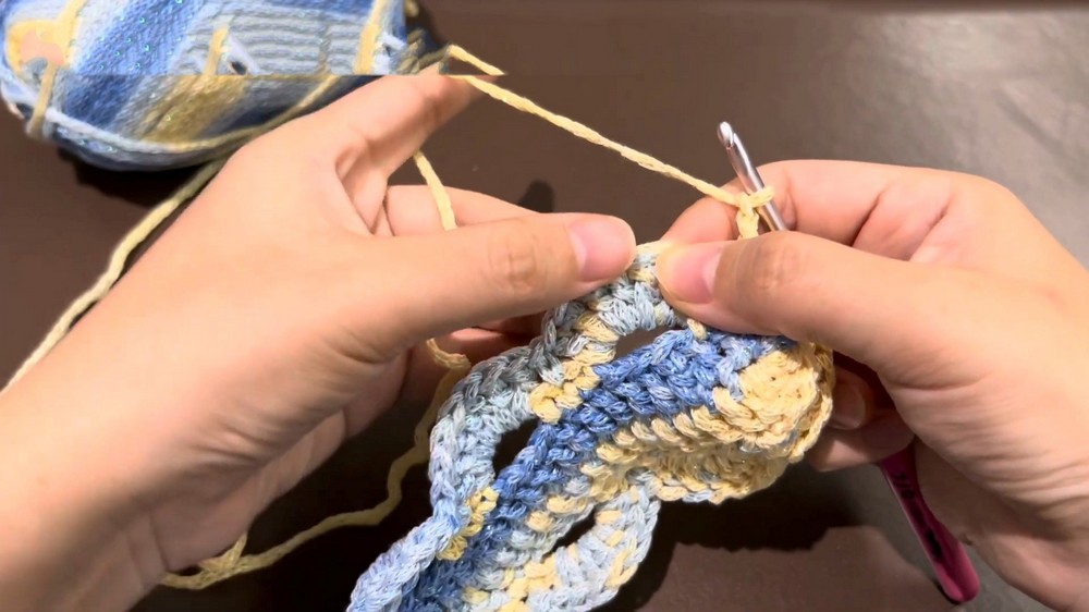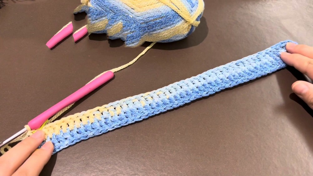 - The strap is made by crocheting rows of double crochet stitches to achieve thickness and durability.