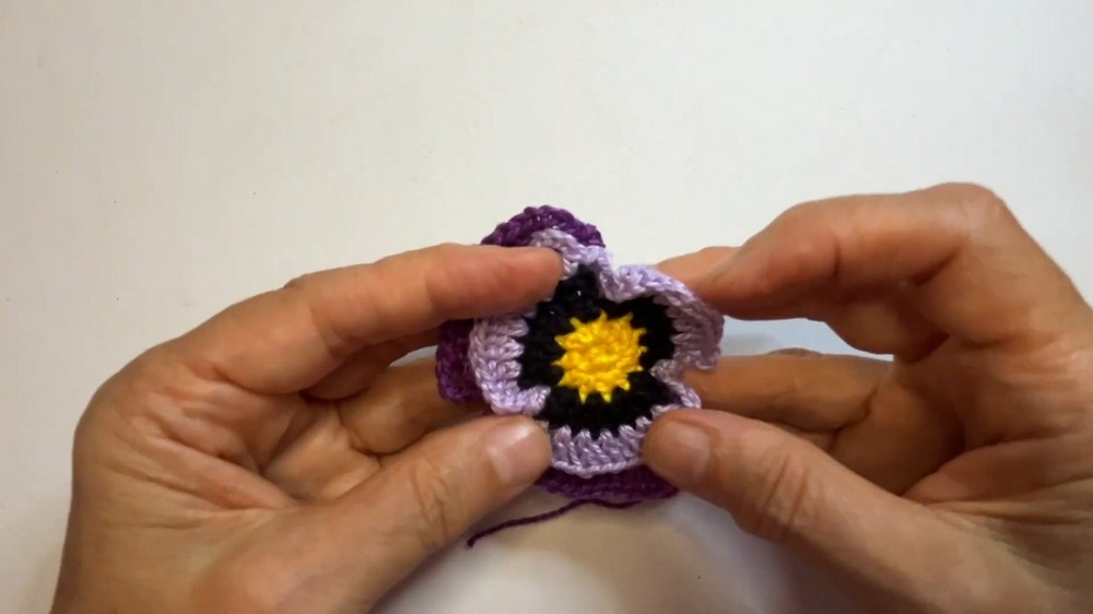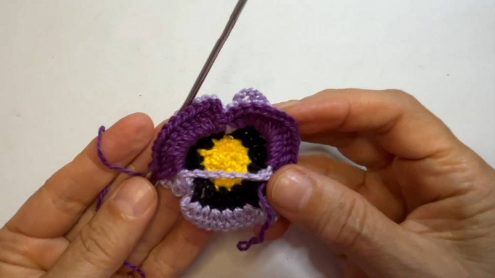 Subsequent rounds involve a combination of basic crochet stitches, progressively shaping the petals of the pansy.