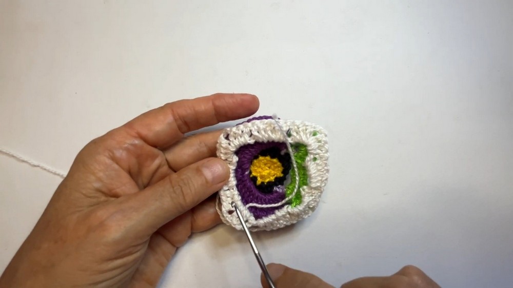 The square is then built outward from the flower over four rounds, using a consistent pattern of stitches.