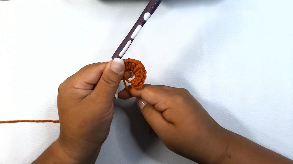 - Start with the pumpkin-colored yarn and create a magic ring as the hat’s foundation.