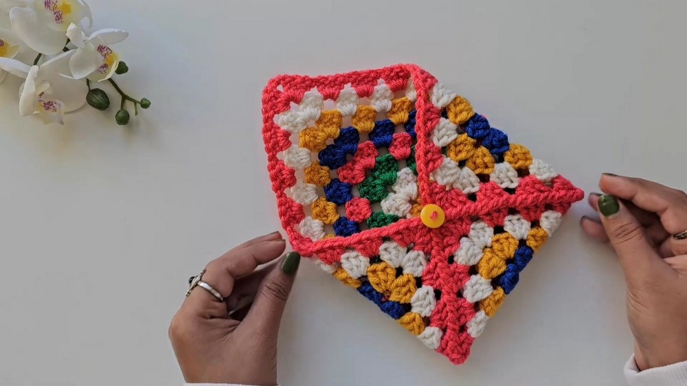 Once the square is complete, the sides are folded and joined to form the pouch, with a button added for closure. This easy and vibrant project is perfect for crochet enthusiasts. So, follow through with us for the complete tutorial.