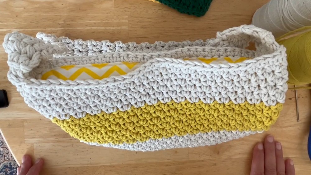 - The completed bag body is sturdy, stylish, and textured thanks to the alternate stitch pattern and color changes.
