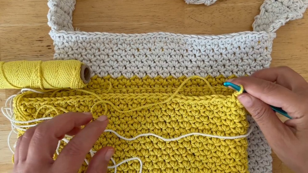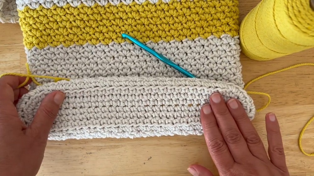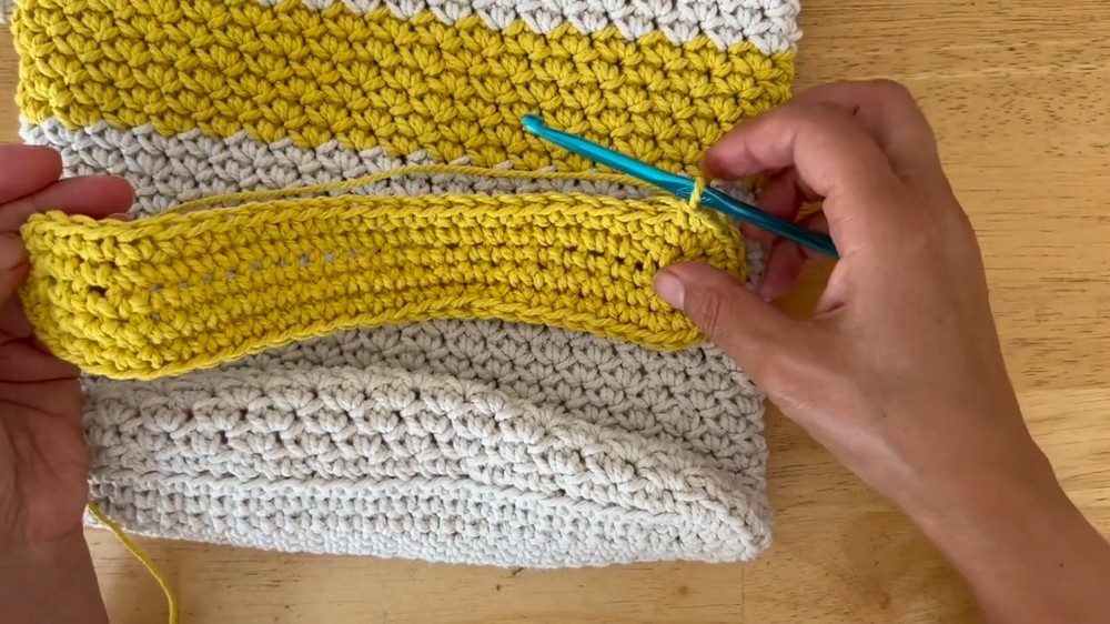 - Complete several rows in beige color before finishing with a few rows of mustard yellow for the finishing touch.