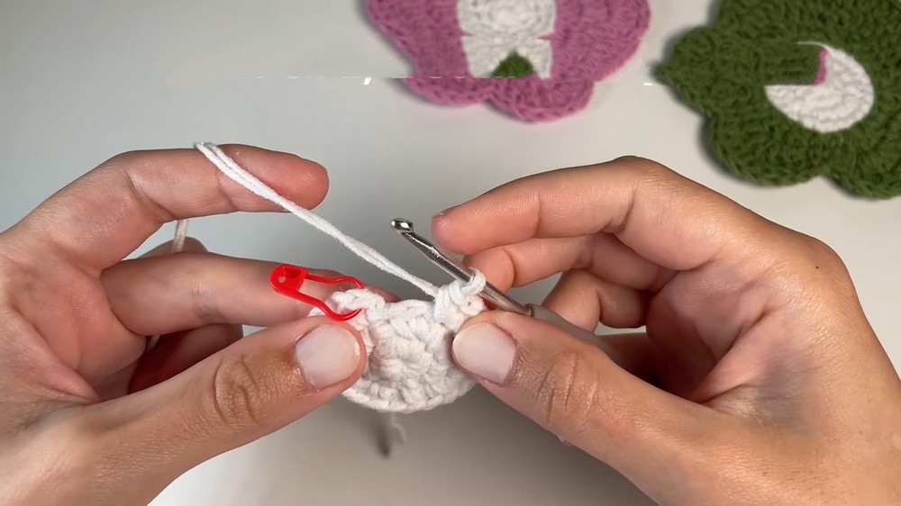 - A clean transitioning row is added using slip stitches around the edge. This adds a polished look to the base before starting the flower petals.