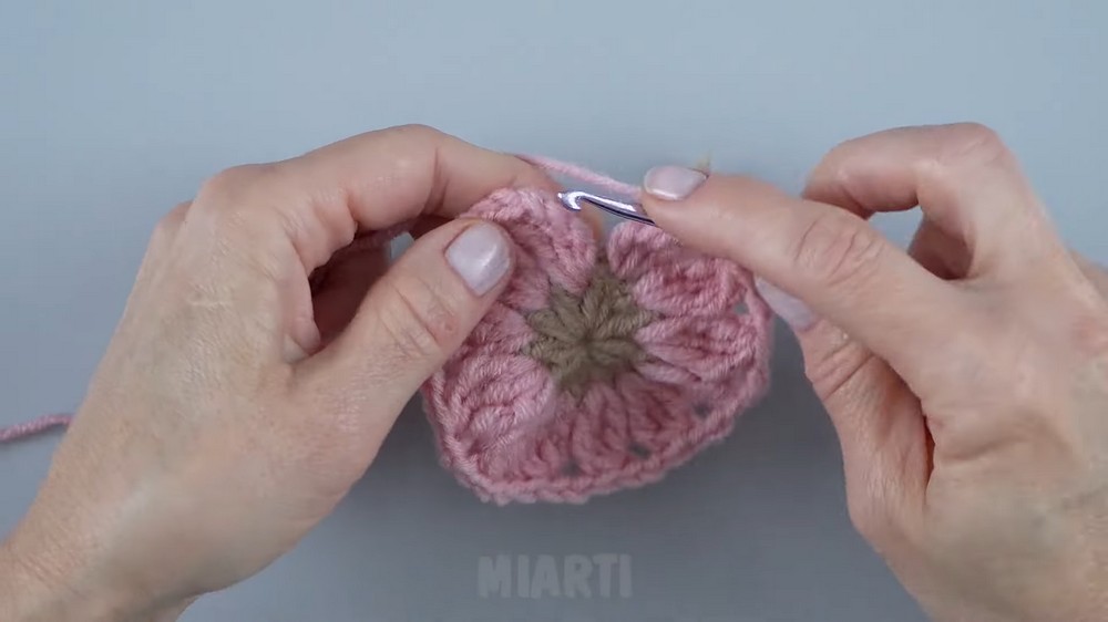 - The pattern is repeated until the round is complete, and the row is closed with a slip stitch.