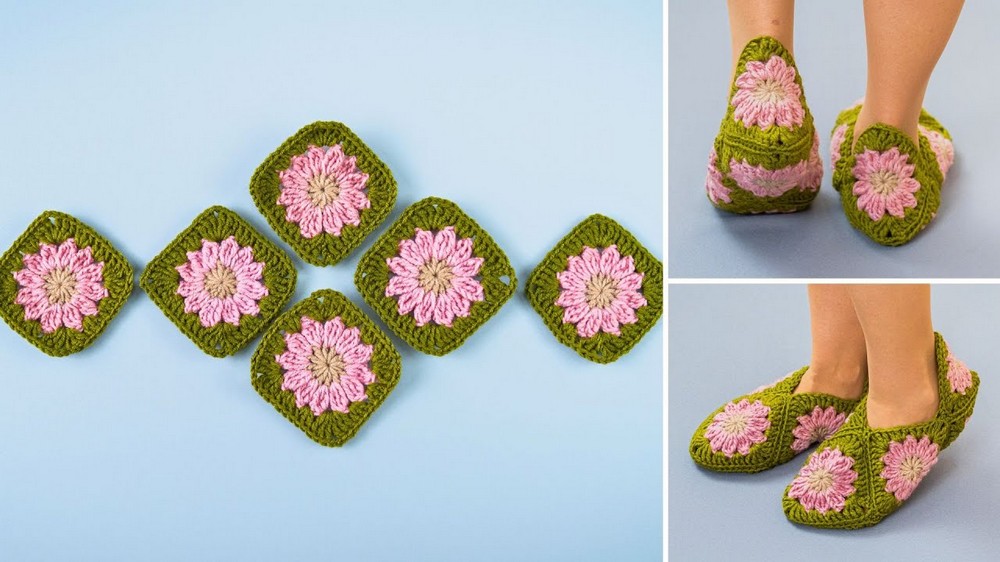 Learn how to crochet a beautiful crochet motif slipper using simple yet elegant techniques with a tutorial for beginners. It begins with a magic ring, followed by a first row of chain stitches and double crochets, joined with a slip stitch. The second row introduces a contrasting color and features treble crochet clusters combined with chain spaces to form a delicate pattern. The third row builds on this with more treble and double crochet groups, continuing the motif’s intricate design.