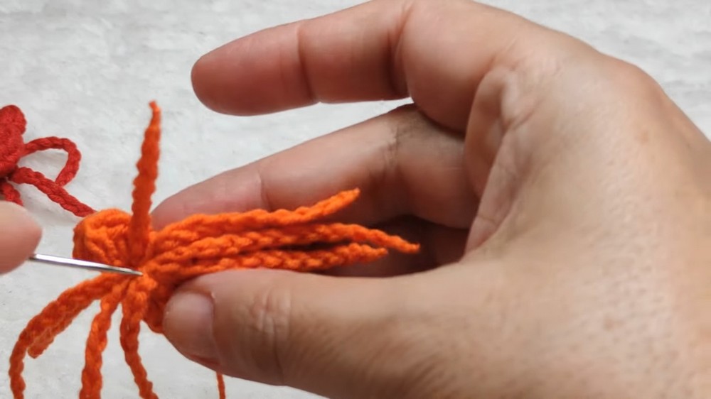 - Fix the head in place with a slip stitch, add chains for support, and secure the yarn.