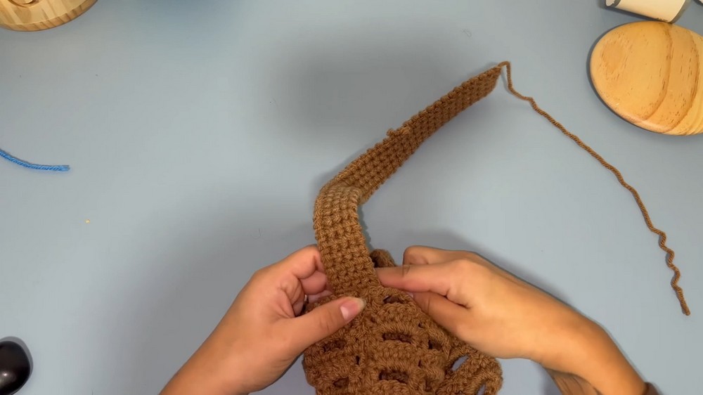Alexis stitches the straps onto specific areas of the bag, ensuring a snug and symmetrical fit. Placement under the mesh holes makes the straps blend seamlessly into the design. She demonstrates how to secure them using a rectangular stitching approach and optional knots for added strength.