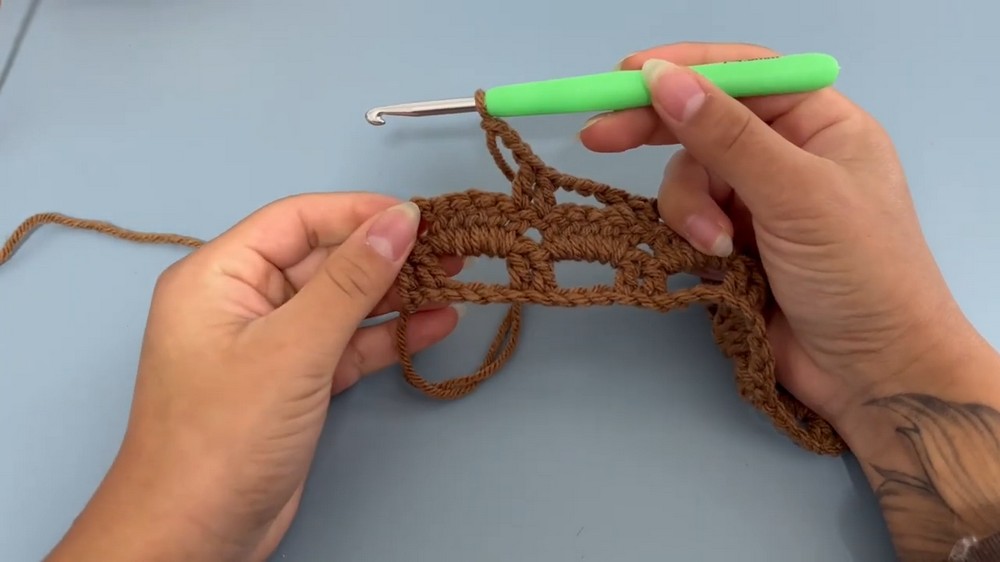Once the mesh structure is created, Alexis demonstrates how to alternate between cluster rows and chain rows to build the height of the bag. She emphasizes the importance of aligning stitches in subsequent rows.