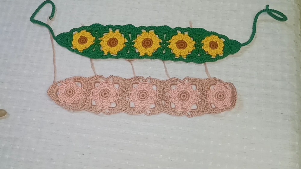 The triangles are created to form the ends of the headband. These follow a similar design to the sunflower squares but with fewer petals: