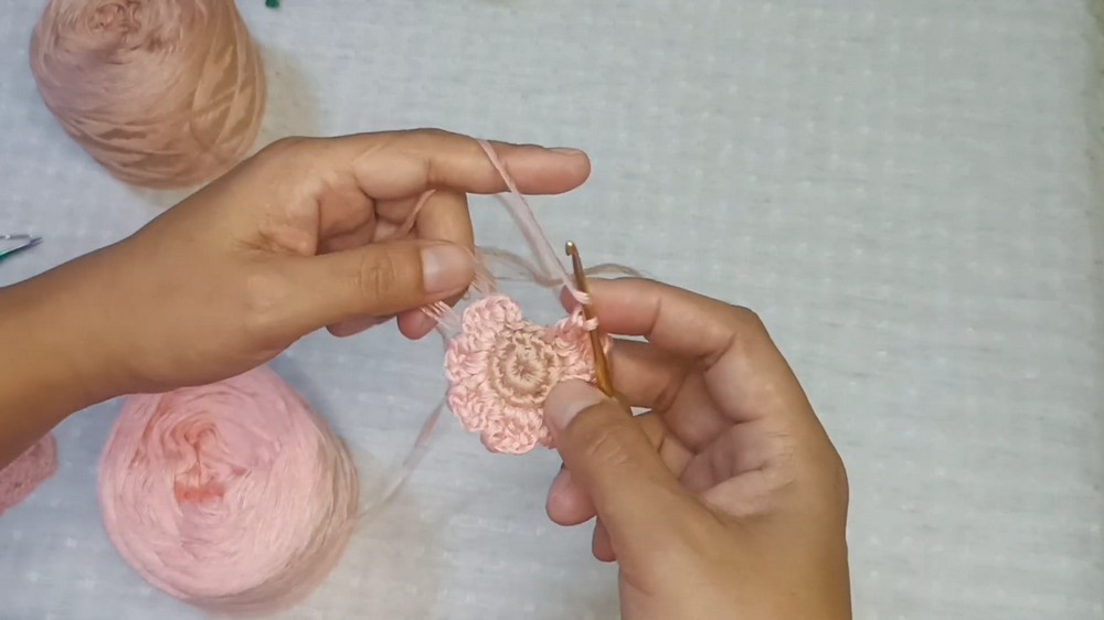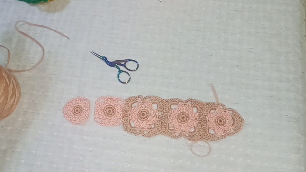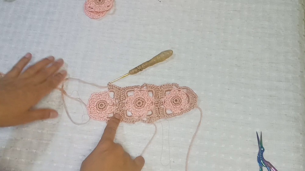 - Start by connecting two sunflower squares. Work along their edges using chains and single crochet stitches.