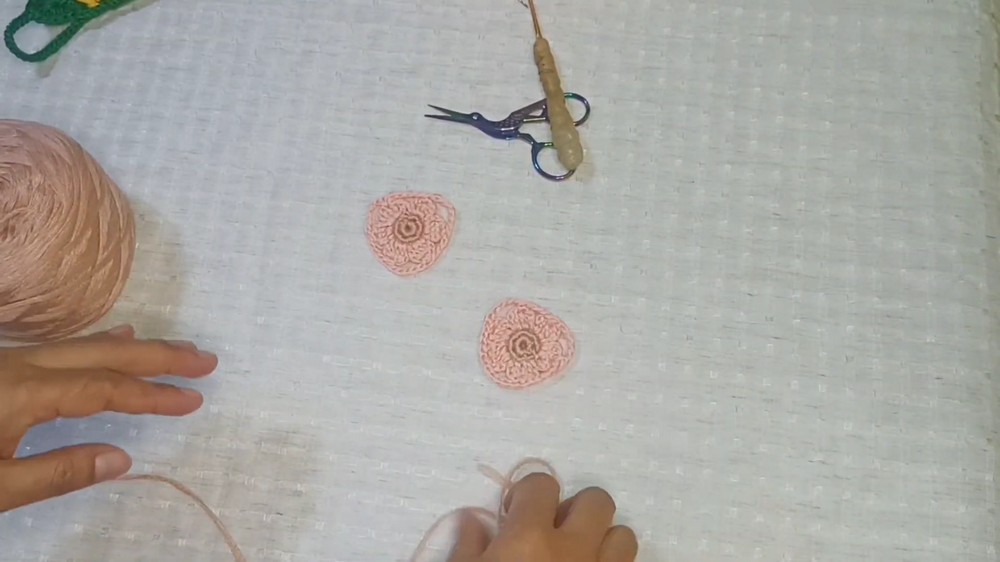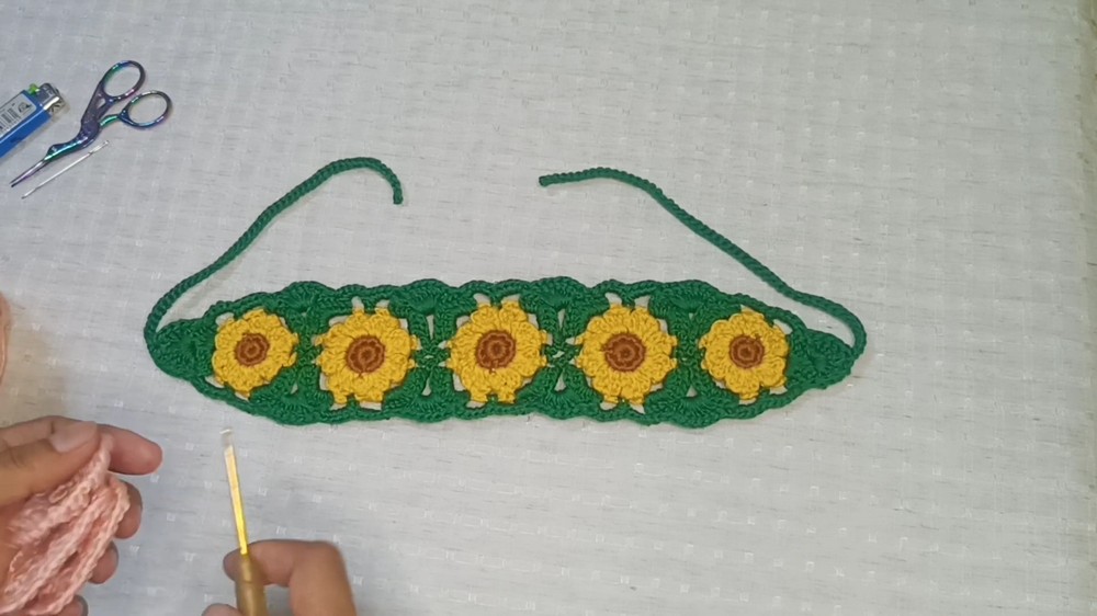The headband consists of square motifs resembling sunflowers. Here’s how they are made: