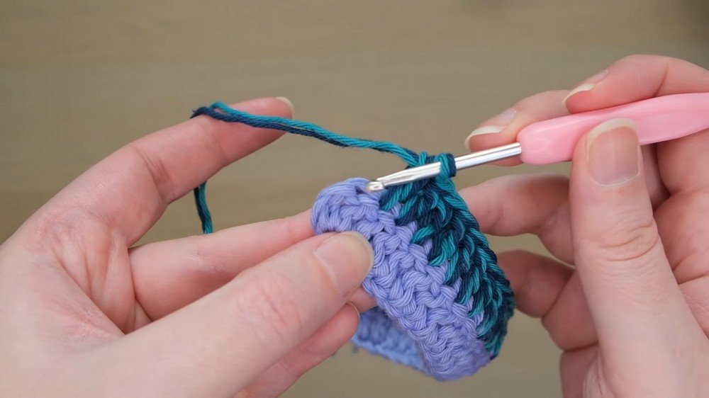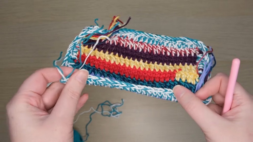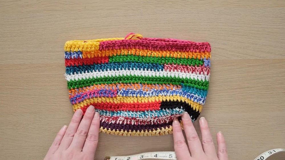 - The creator alternates between the bag’s inside and outside for each row to give the texture a unique look.