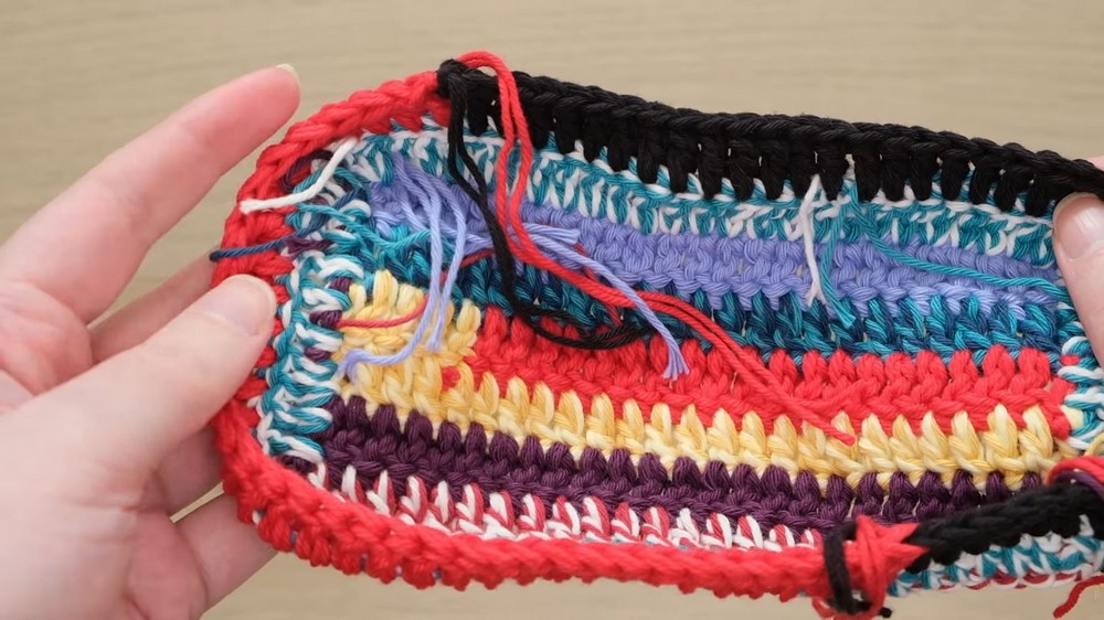 - Yarn ends from color changes are left inside the bag to be hidden later by the lining.
