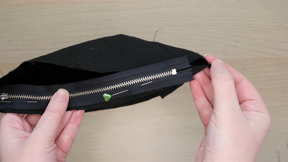 - A zipper is sewn onto the lining to ensure the bag is secure and functional.