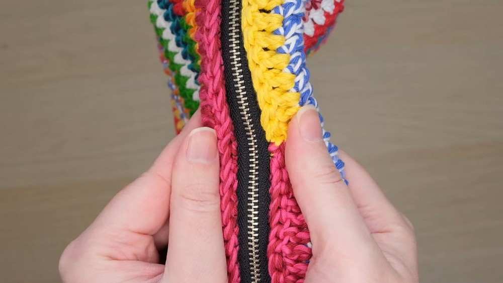 - The lining is placed inside the crochet bag with the zipper attached.
