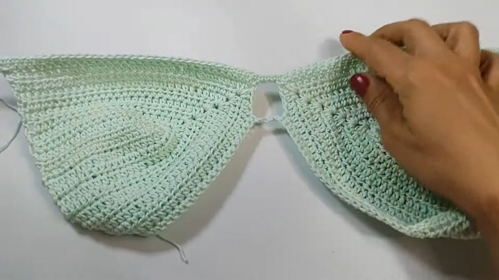 - After completing both cups, the edges are connected using single crochet stitches, skipping certain stitches for the neckline detail.