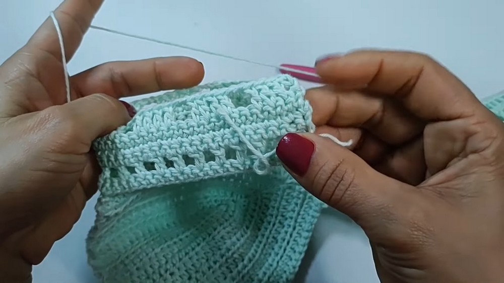 - Details are added by skipping specific stitches and forming a decorative chain pattern.
