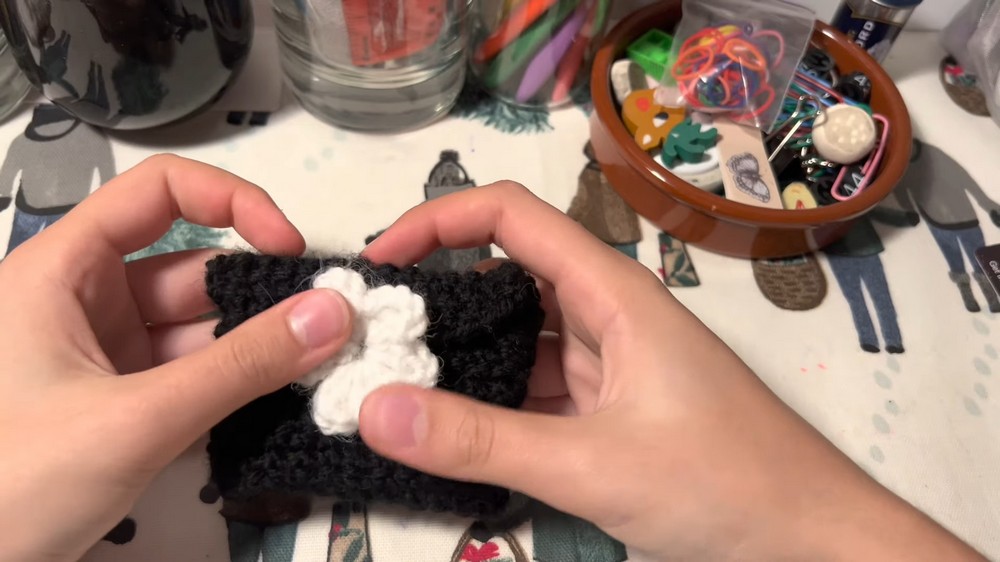 - These elements are attached using long ends of yarn, tied securely, and positioned to enhance the symmetry and aesthetic appeal of the cardholder.