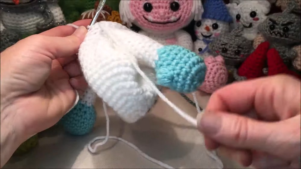 Once the body is finished and stuffed, the final row stitches are decreased to close the bottom. Loose ends are tied securely, and the arms are adjusted to ensure they sit forward. The ends of the arms are tied at the neck to strengthen their position.
