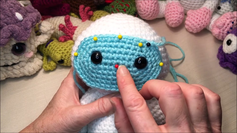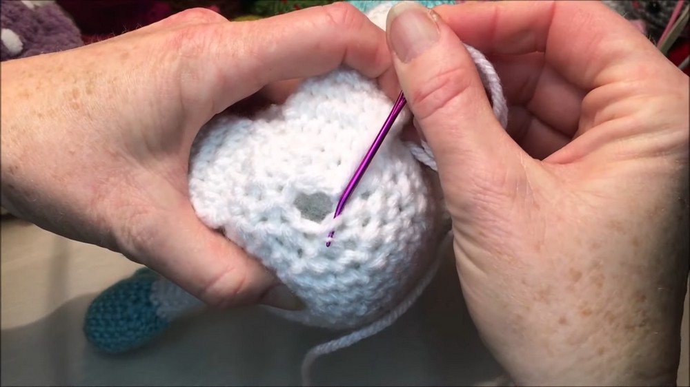 The top of the head is crocheted, with careful shaping that includes strategic increases and decreases. Focus is placed on creating an oblong shape, forming “cheeks” on each side. The head is stuffed firmly to hold its shape.