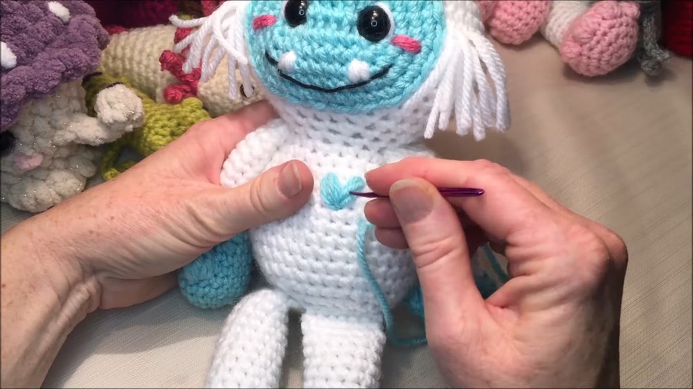 The body is crocheted from the neck down, gradually increasing to form the torso and chest. The legs are attached midway through by crocheting around the tops of the legs. Stuffing is added incrementally to maintain the balance and proportion.