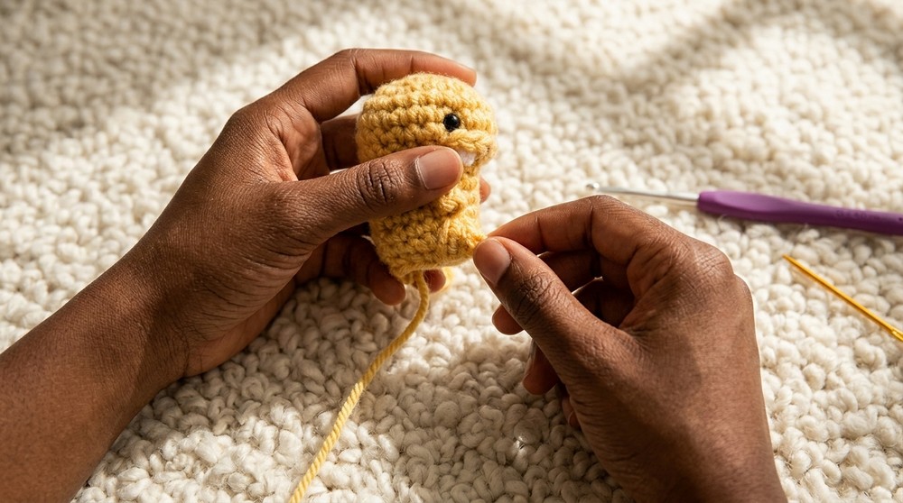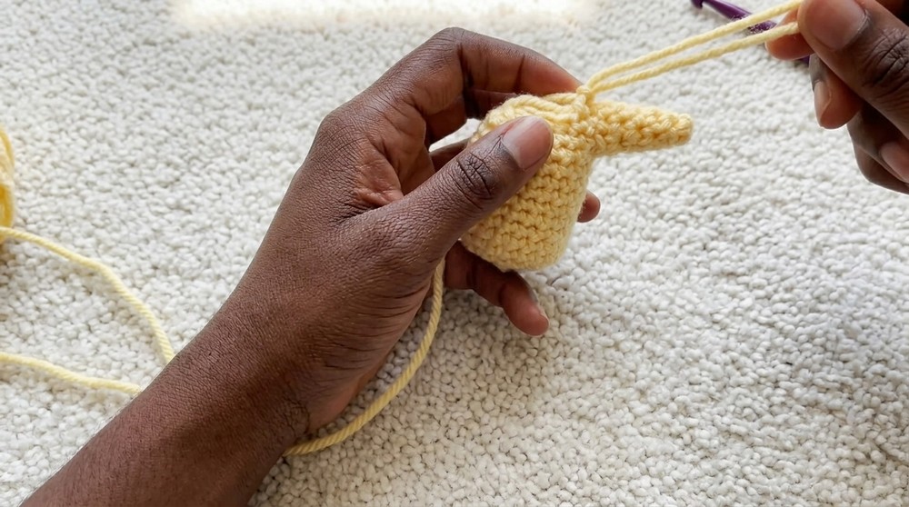 - After stuffing, sew the bottom hole closed neatly with the long yarn tail using a gather or ladder stitch.