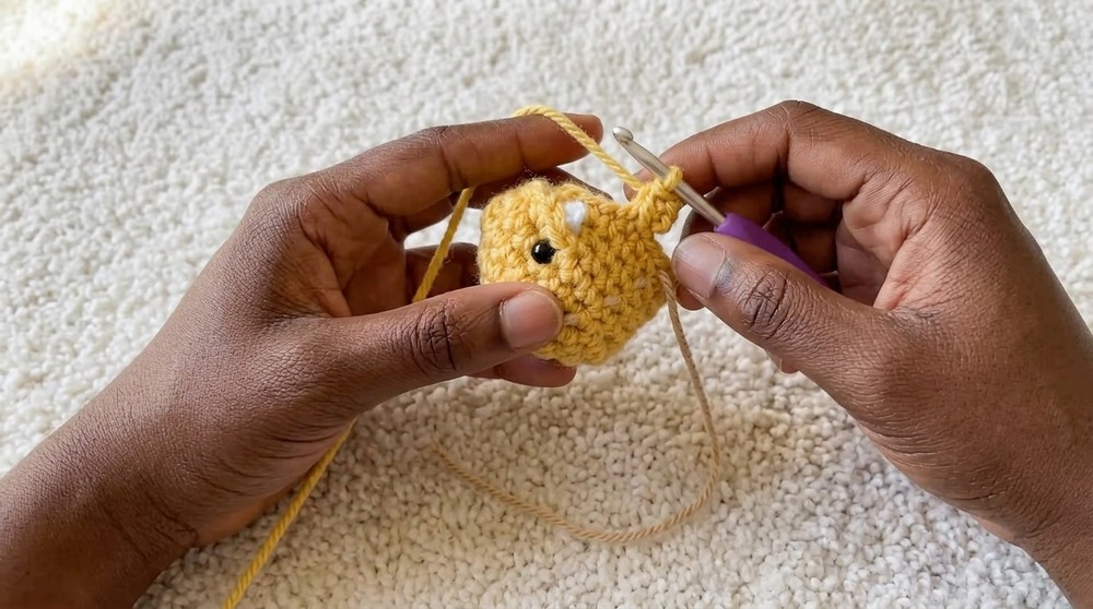 - Add 6 mm safety eyes or embroider in place at sides of the mouth, at the outer edge of the upper lip.