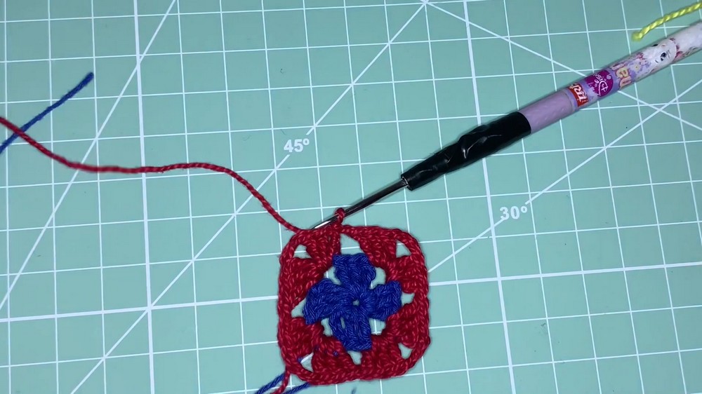 Round 2 (Red): Join yarn in any corner (ch-3 space). Work a “corner shell”: (3 dc, ch 3, 3 dc) in the corner. Ch 1, move to the next corner. Repeat around [03:13].