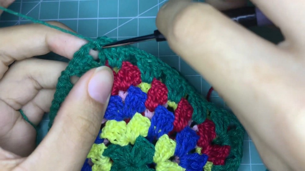 Rounds 3-5 (Pink, Yellow, Green): Continue expanding. In corners, work (3 dc, ch 3, 3 dc). In side ch-1 spaces, work 3 dc. Always separate corner shells and side blocks with ch 1 [05:40].