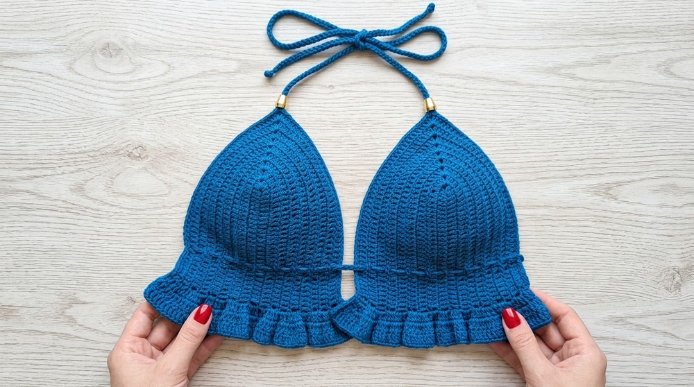 - This top is worked in two “triangle” cups with side increases for shaping, plus a frilled/fan edge and decorative tie strings.