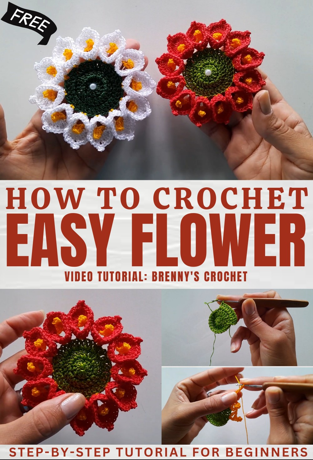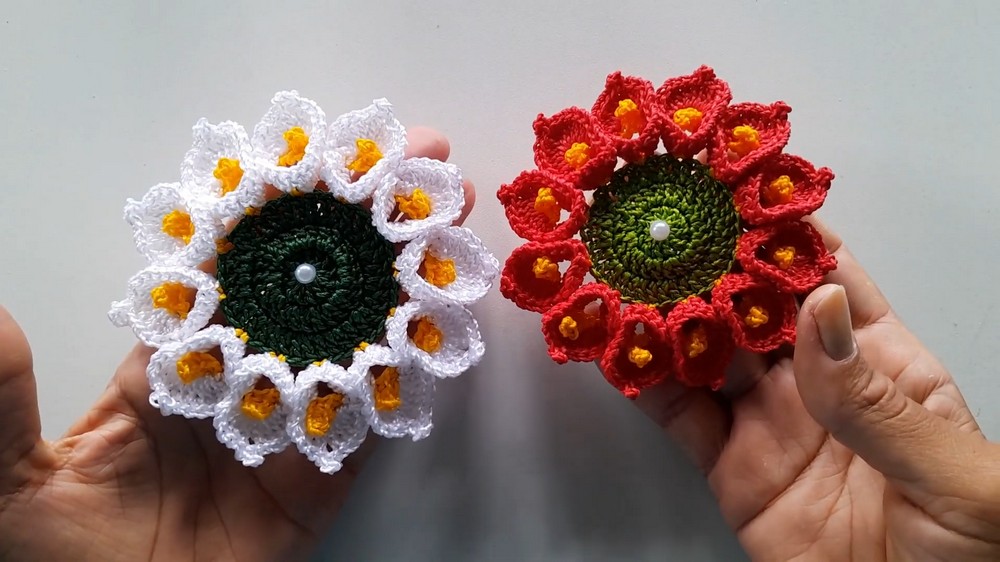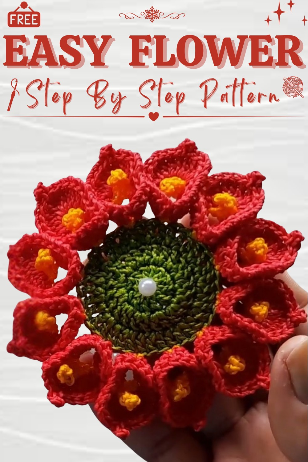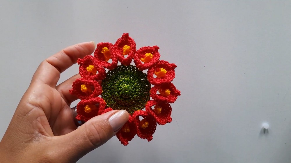 - Yarn: Medium weight cotton yarn in Red, White, Golden Yellow, Green (choose colors as desired for flower, center, and leaves)