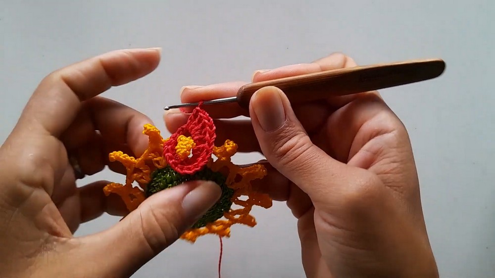 - Petal Formation: Join red in any dc at top of yellow petal base.