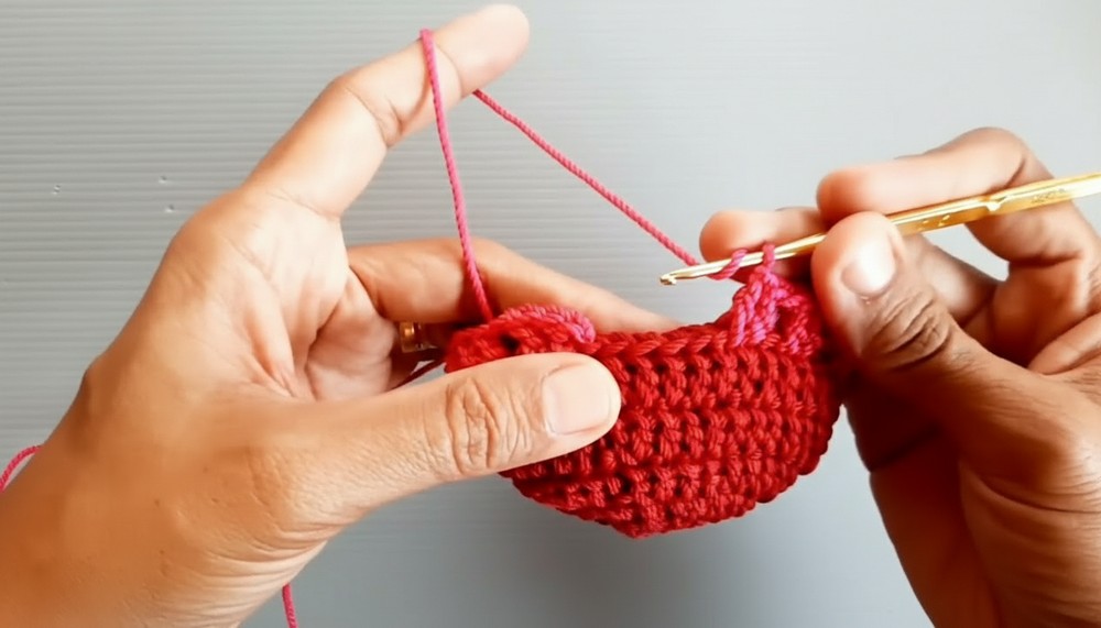 - Start Pink Yarn. Knot securely, then SL ST into the top of the first DC in the round.
