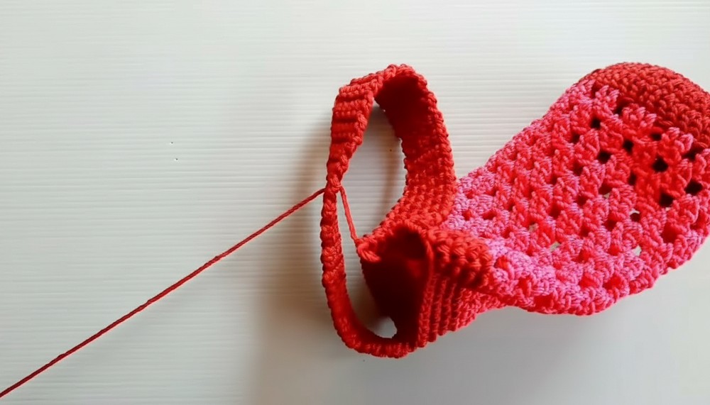 - With SC stitches, sew the strap ends onto the sheath, ensuring the strap is secure.