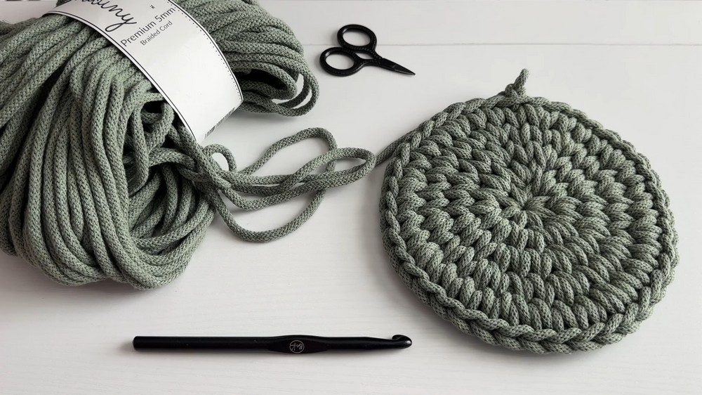 In this tutorial, with the tutor’s basket-making series, learn how to crochet a circular base using the waistcoat stitch. Using 5mm braided cotton cord in eucalyptus green and an 8mm crochet hook, she explains techniques like creating a magic circle, making invisible joins, and gradual increases for each round.