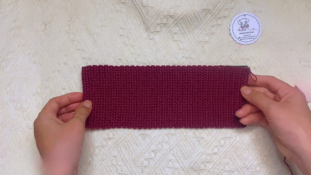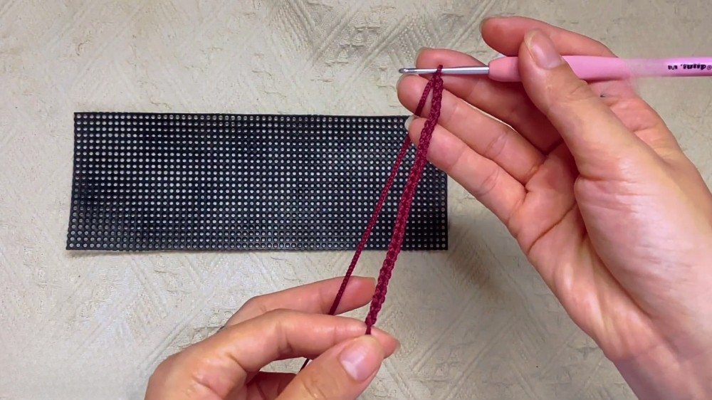 Start by crocheting a foundation chain of single crochets (sc) that matches the width of the canvas. The first row is crocheted into the back loop of each chain stitch for added stability. Continue to crochet rows of single crochet until the piece is long enough to cover the front, back, bottom, and flap of the bag