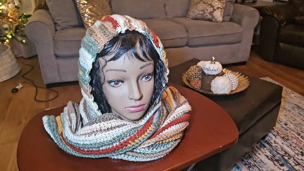 The tutorial focuses on creating a stylish and easy hooded scarf. The project uses a one-row-repeat pattern, ideal for beginners. You can gift this to your mother for Christmas.