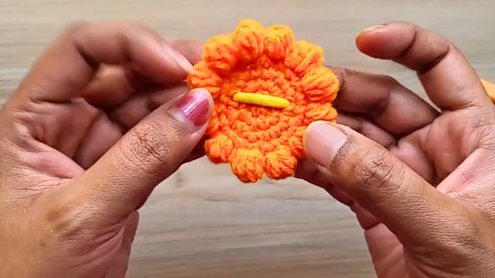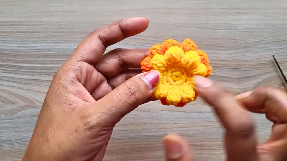 A second, smaller layer is created using a different color of yarn. This piece is made by following the same process of creating a magic ring and increasing stitches. The petals on this layer are made using a similar puff stitch technique. The tutorial then shows how to crochet a final, dark-colored piece to be placed at the center of the flower.