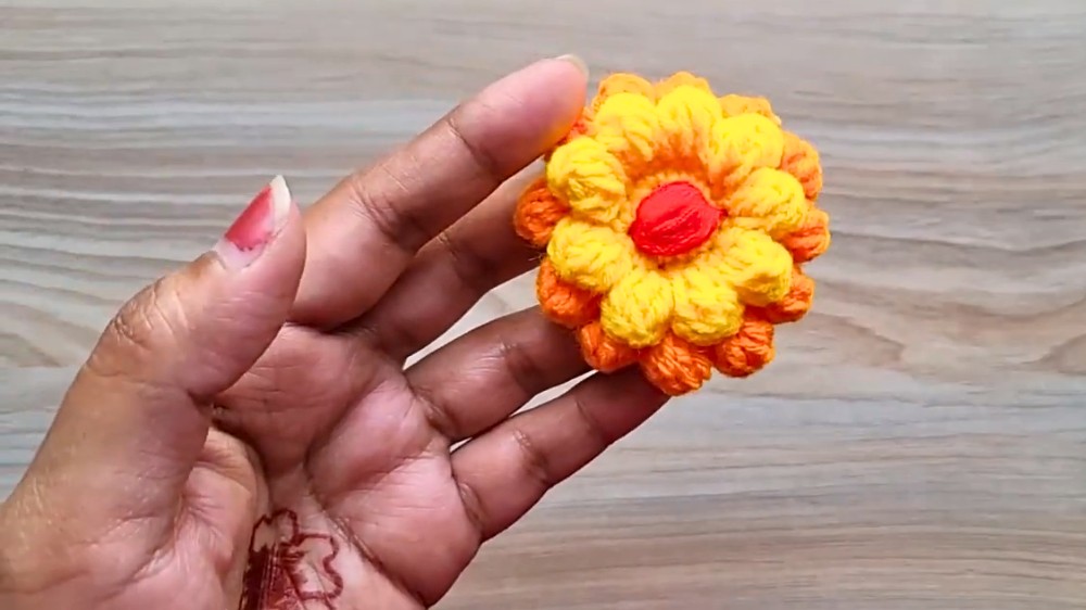 A second, smaller layer is created using a different color of yarn. This piece is made by following the same process of creating a magic ring and increasing stitches. The petals on this layer are made using a similar puff stitch technique. The tutorial then shows how to crochet a final, dark-colored piece to be placed at the center of the flower.