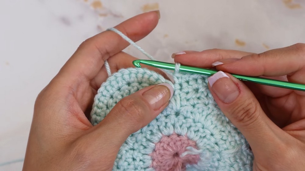 - Using single crochets, the edges of the flowers are joined, ensuring depth and evenness by skipping specific stitches at petal intervals.