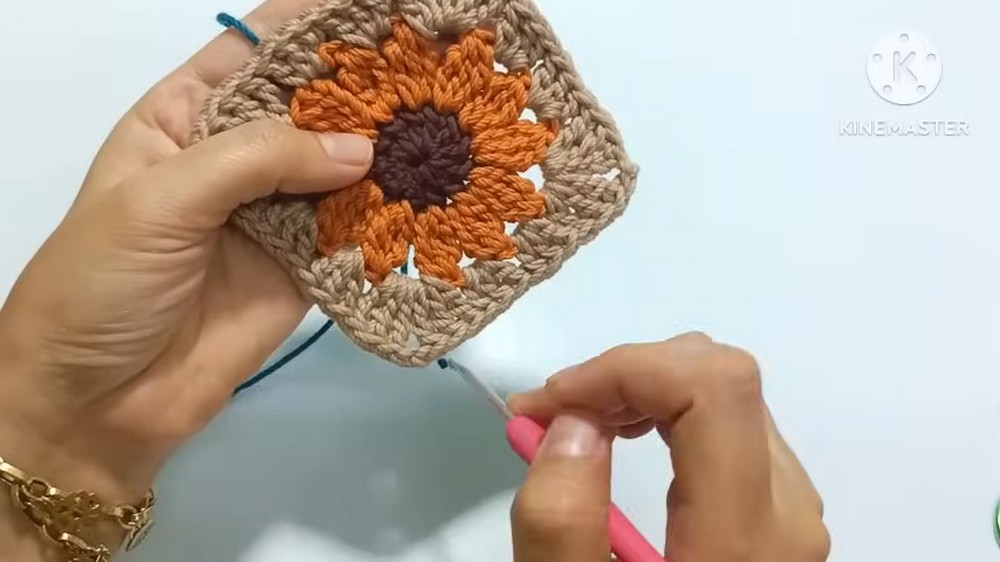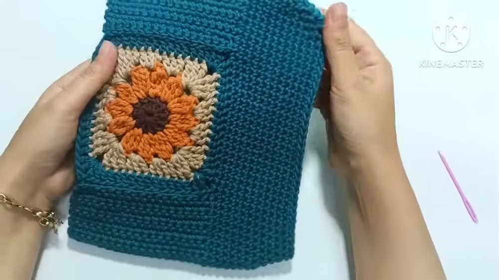 The tutorial then shows how to form the granny square pattern by working in groups of double treble and double crochet stitches. Once the main square is complete, the sides of the bag are added with single crochet stitches and then sewn to the main square.