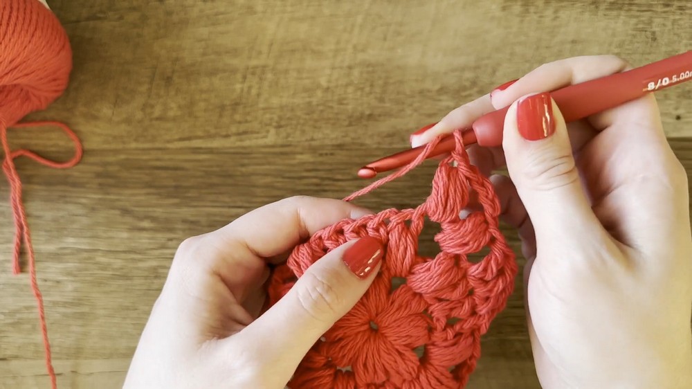 - Corners are formed by creating puff stitches and chaining in between them.