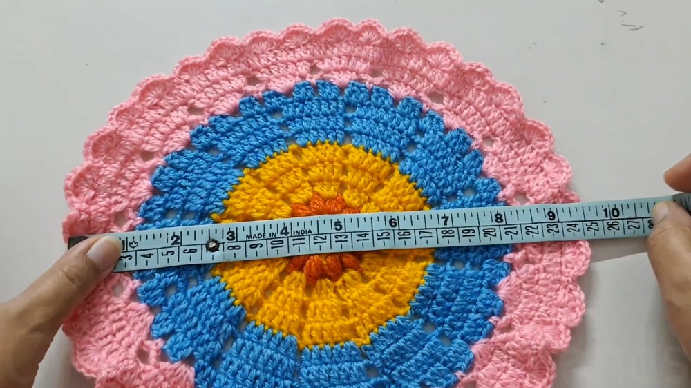 With a step-by-step tutorial, learn how to crochet a stunning and colorful crocheted doily or placemat using four colors of faux acrylic yarn and a 2.5 mm hook. Beginning with a slip knot and chain stitch, the project progresses through multiple rounds that involve double crochets, puff petals, chain spaces, and color changes to create intricate patterns. The finished doily, measuring approximately 25 cm in diameter, serves as a versatile creation — perfect as a table centerpiece, mat, pot holder, or a thoughtful handmade gift.