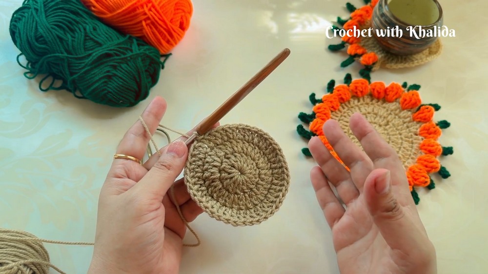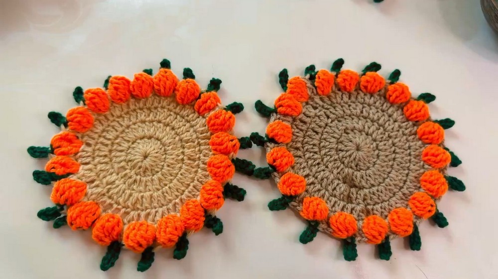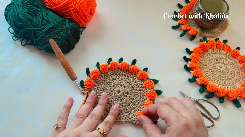 The final round is where the pumpkin design is created. The creator uses an alternating pattern of triple crochets and single crochets to form small pumpkin shapes around the edge of the coaster. A small green stem is also added at this stage to complete the pumpkin design.