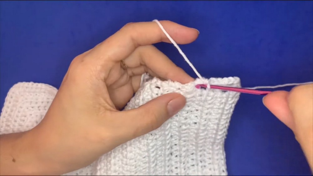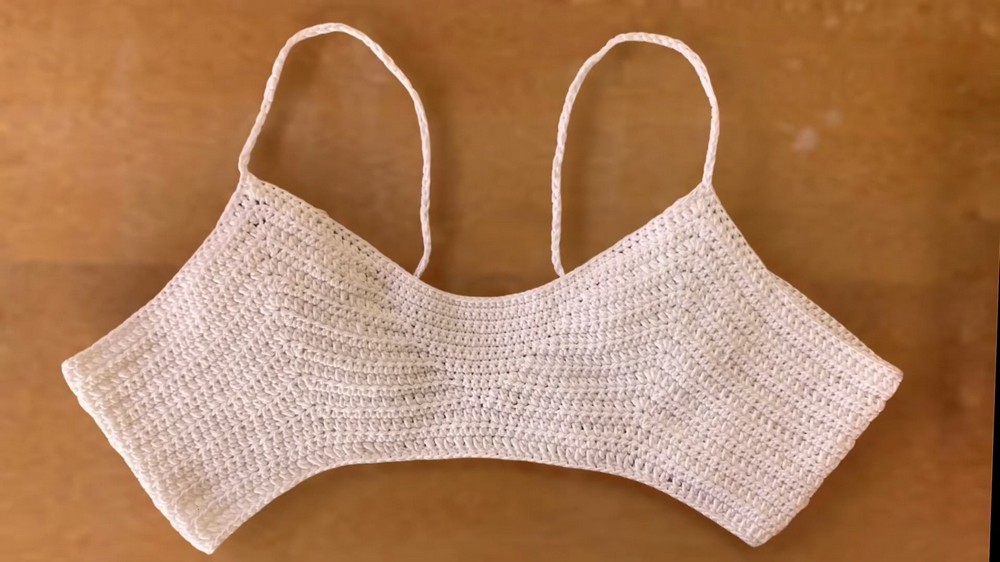 As the piece grows, you shape the arm openings and neckline by changing stitch height and spacing. When the main panel reaches the right length, you finish with clear edging and add straps or ties so the top sits securely on your shoulders.