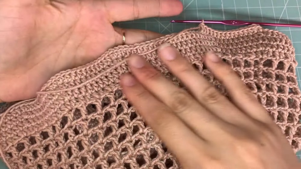 During these side rounds, you follow a specific chart to fill in a solid triangle in the middle while keeping the rest of the hat looking like a net.
