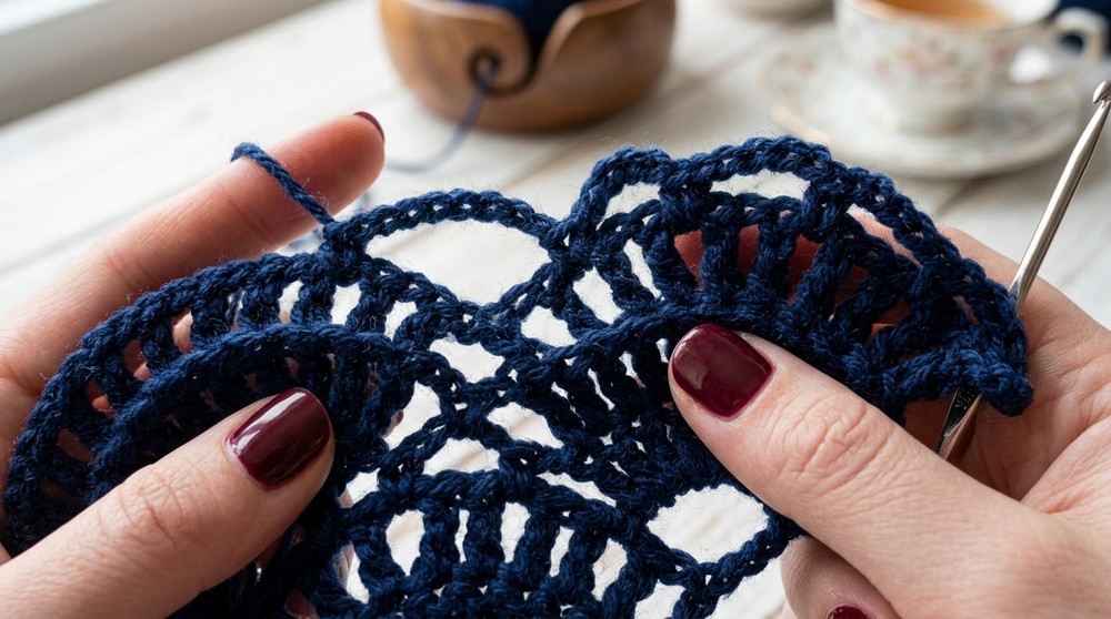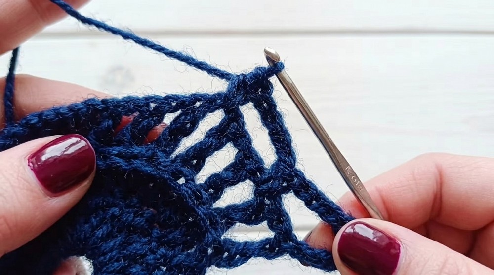 - For each mesh section: ch 5, sc in next mesh/net, continue as previously described.